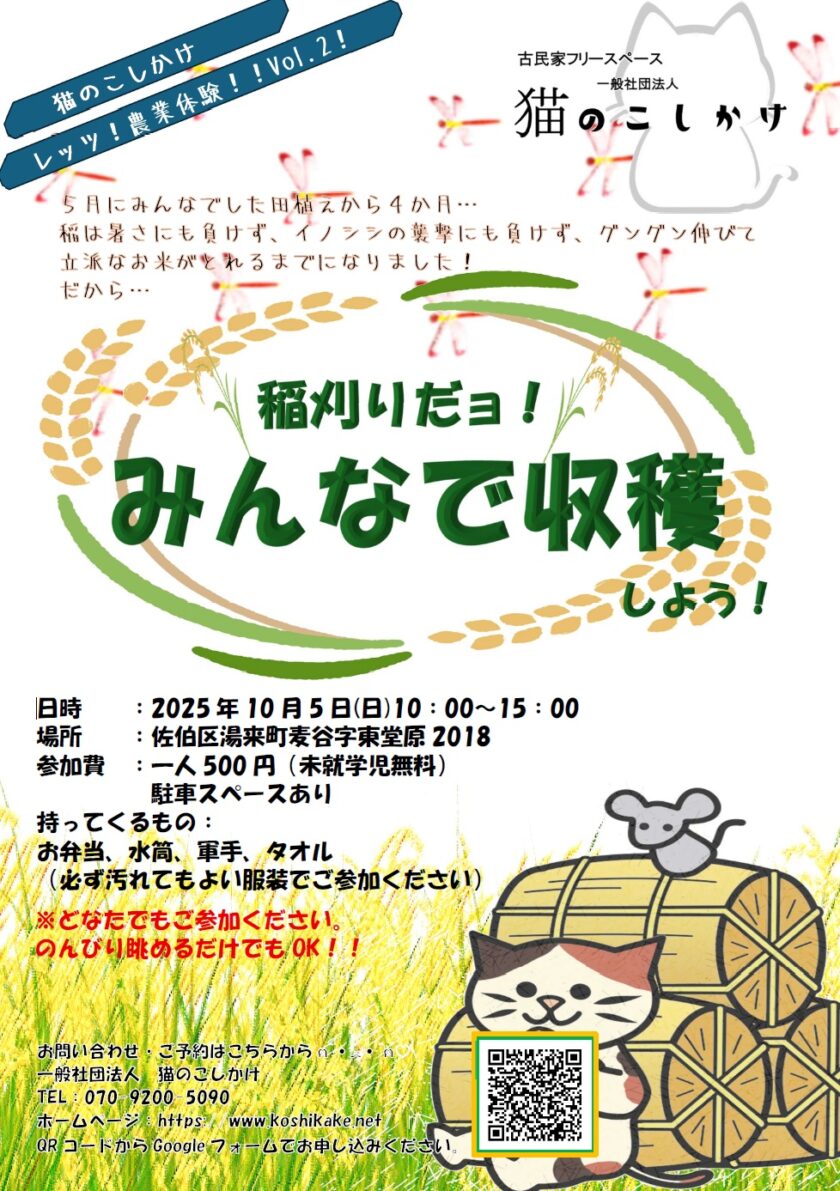イベントのご案内 2025年9月21日 by admin558 湯来町の「築100年の古民家」をリノベーションしてオープンした「不登校の子供のフリースペース猫のこしかけ」が、10月5日(日)に稲刈りイベントを開催されます。詳しくはチラシをご覧ください。たくさんの方のご参加をお待ちしています!
